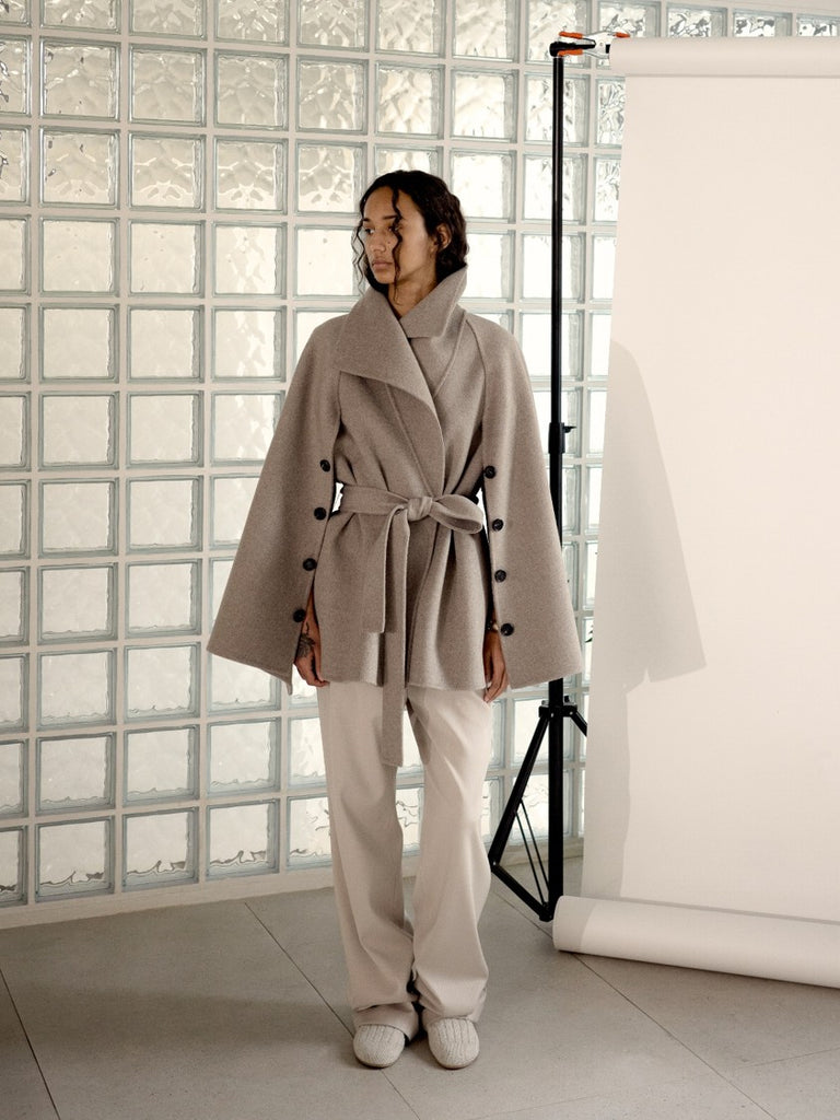 Draped-Collar Cashmere Coat with Convertible Cape Sleeves