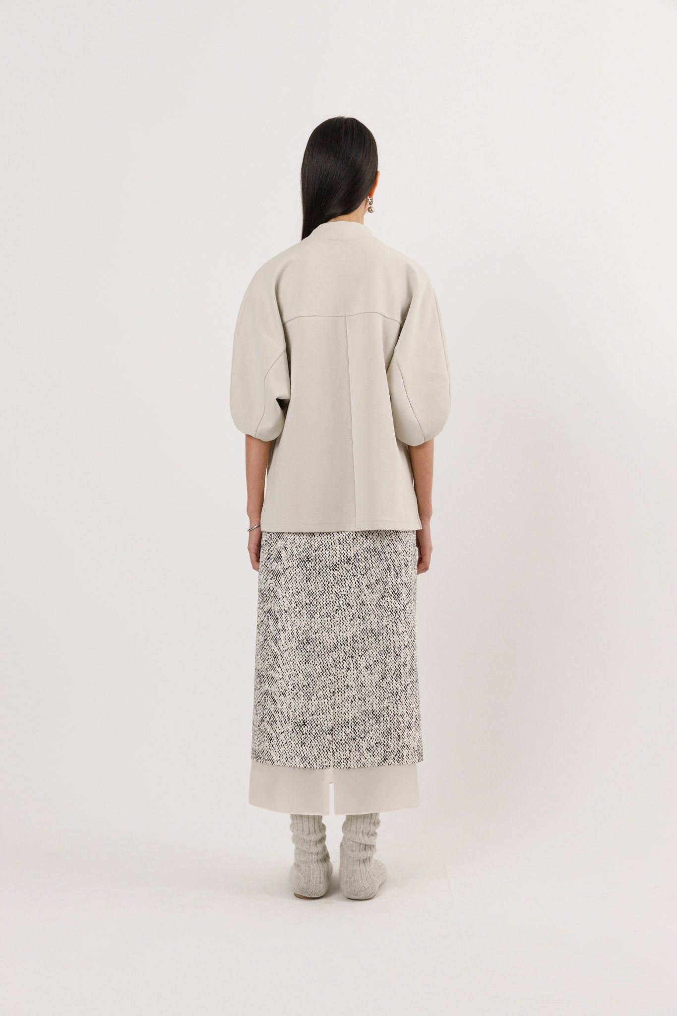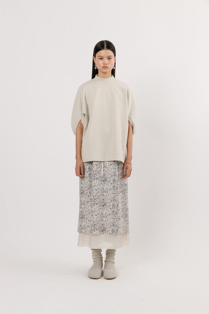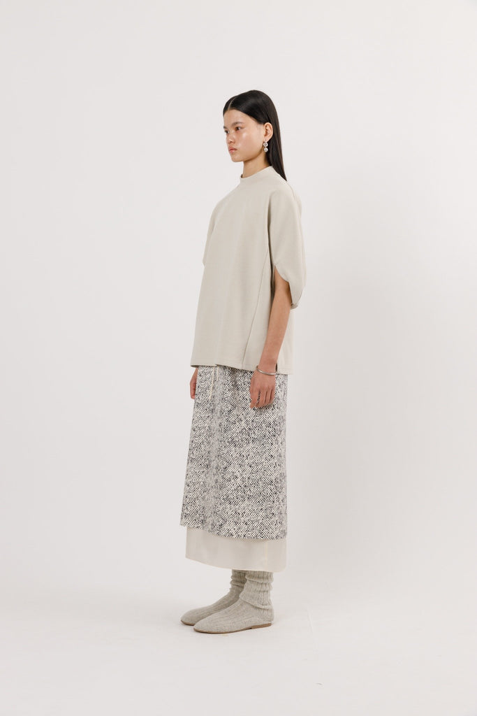 This midi skirt is designed with a layered-effect construction that artfully contrasts texture and tone. The outer layer is made from 100% silk, printed with an abstract dot pattern that catches the light with a soft sheen. Beneath it lies a matching-toned cupro layer, giving the illusion of a second skirt—though both layers are fully integrated. An elasticated back waistband ensures comfort, while a side tie fastening offers subtle adjustability. The softly draped silhouette flows with the body, blending elegance and ease with a quiet sense of playfulness.